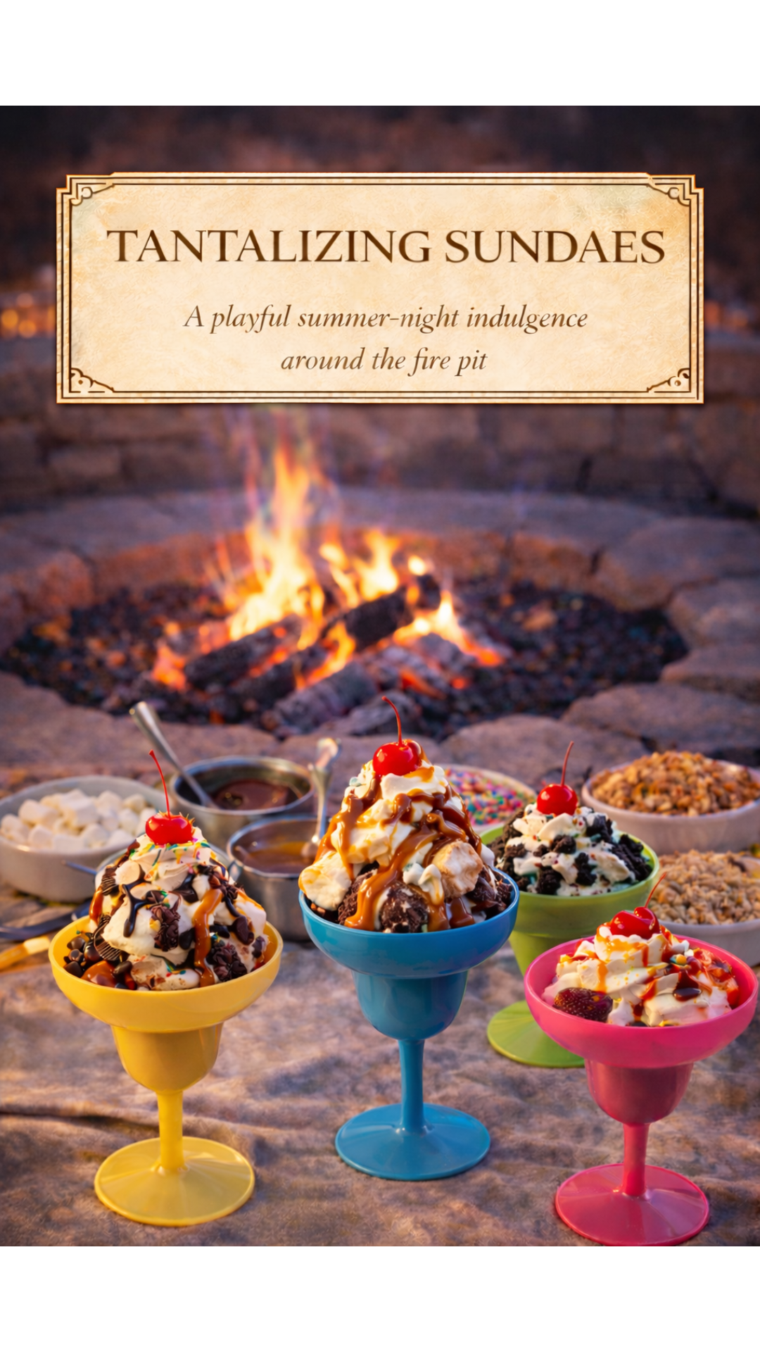 Later, the night winds down around the fire with tantalizing sundaes. Bowls are built, stories continue, and the glow of the fire creates an easy close to a joyful day. Some linger late, others drift off when they’re ready—every choice is welcome.