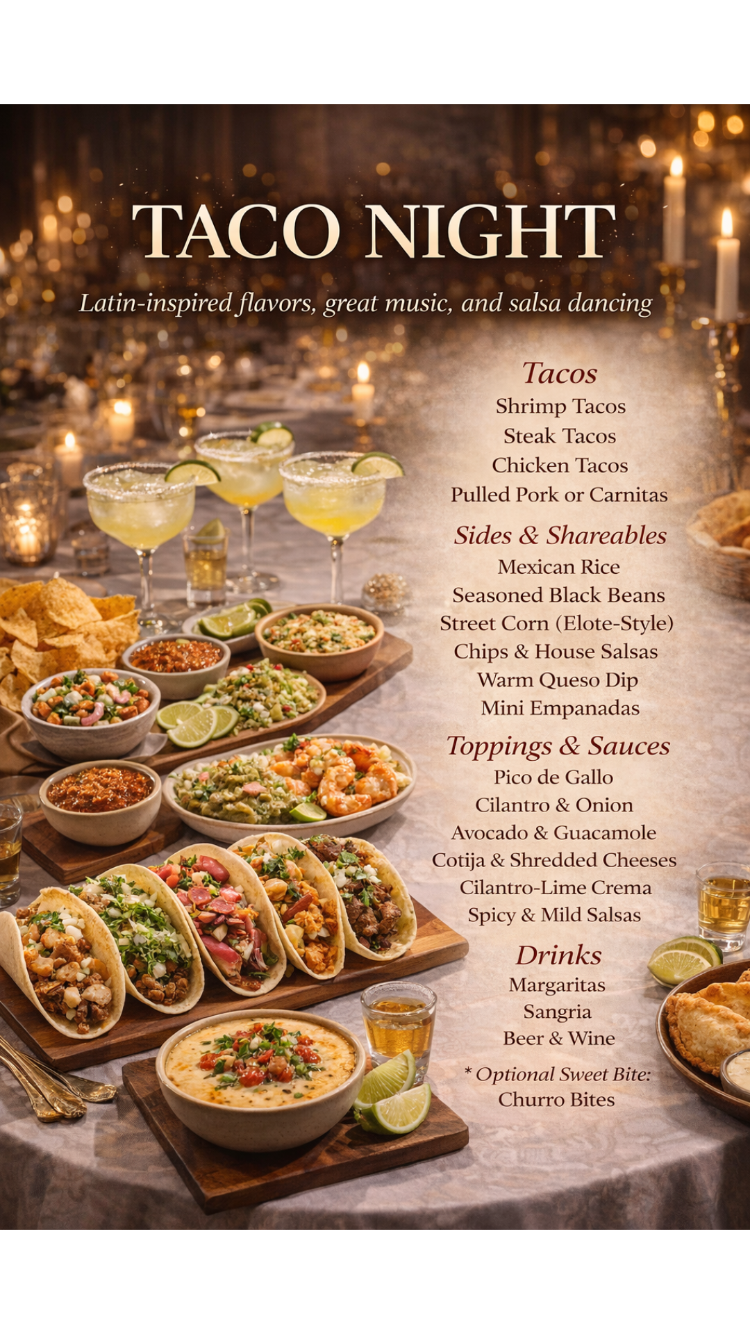 Build-your-own tacos, fresh sides, and bold flavors set the tone for a fun, relaxed evening. Music fills the space, laughter grows louder, and before long, the room comes alive with salsa dancing. Come get your salsa on—on the dance floor or on your plate—with chips, salsa, and margaritas available for those who’d like them.
